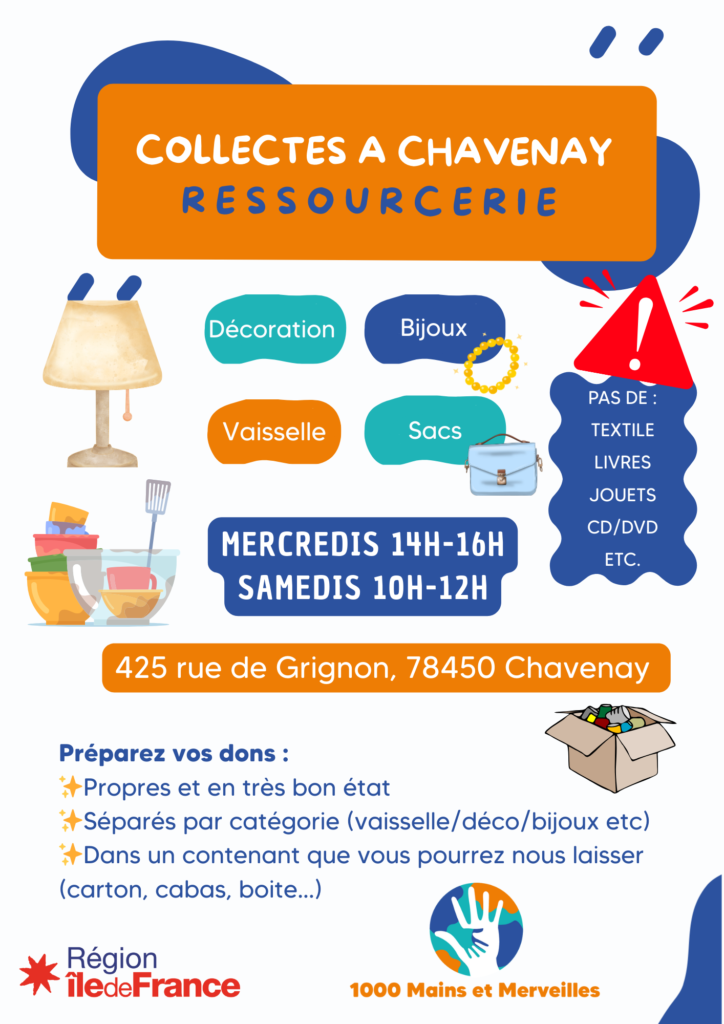 Découvrez la nouvelle ressourcerie « 1 000 Mains et Merveilles » à Chavenay, récemment ouverte dans le village. Elle vous accueille les mercredis de 14h à 16h et les samedis de 10h à 12h, au 425 rue de Grignon. Venez y déposer vos bijoux, objets de décoration, vaisselle et sacs en bon état et propres.